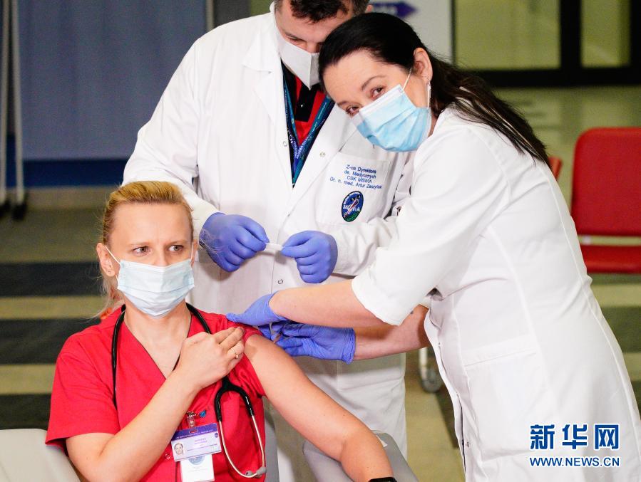12月27日,在波蘭首都華沙一家醫院,一名醫生接種新冠疫苗。新華社發(亞普·阿林攝)