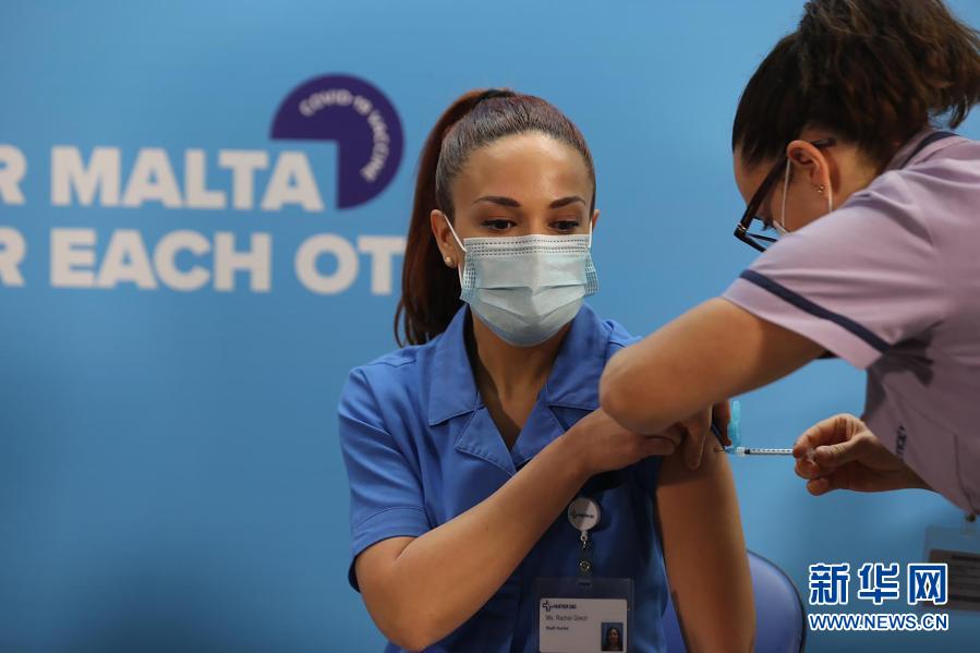 12月27日,在馬耳他瓦萊塔,國立圣母醫院護士蕾切爾·格雷奇接種新冠疫苗。新華社發(喬納森·博格 攝)
