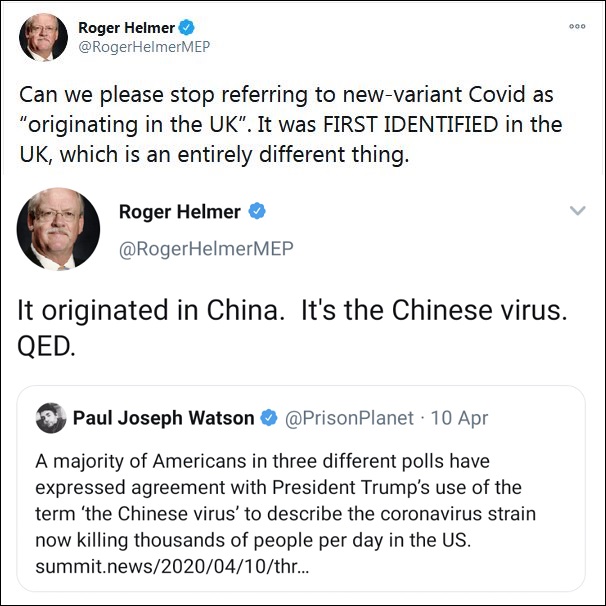 英國出現(xiàn)變異新冠病毒后,世衛(wèi)組織(WHO)將起源地列為英國,不少主流媒體也引用了相關言論。但這讓英國右翼政黨獨立黨(UKIP)成員,曾擔任歐洲議會議員羅杰·赫爾默坐不住了。