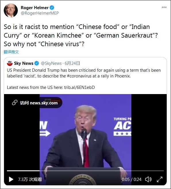6月24日,赫爾默轉發(fā)了特朗普集會上喊“功夫病毒”的視頻,并評論稱:“說中國菜、印度菜、韓國泡菜或德國酸菜是種族歧視嗎?那么,為什么‘中國病毒’(是呢)?”