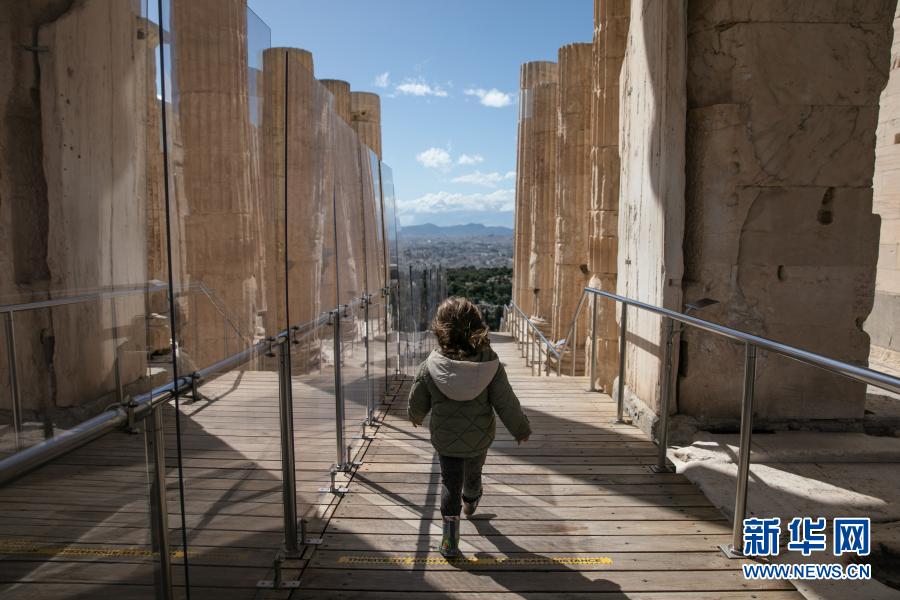 3月22日,一名游客游覽希臘雅典衛城。希臘露天考古遺跡22日起恢復開放。游客需遵守保持社交距離和佩戴口罩等防疫規定。新華社發(萊夫特里斯·帕察里斯攝)