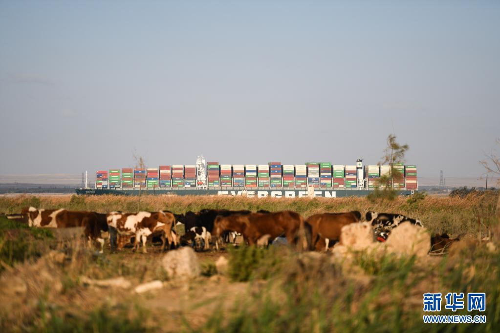 這是3月29日拍攝的移動至埃及蘇伊士運河正常航道上的重型貨輪。