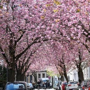 近日,德國西部城市波恩老城區(qū)的櫻花盛開,吸引了許多游人前來觀賞。