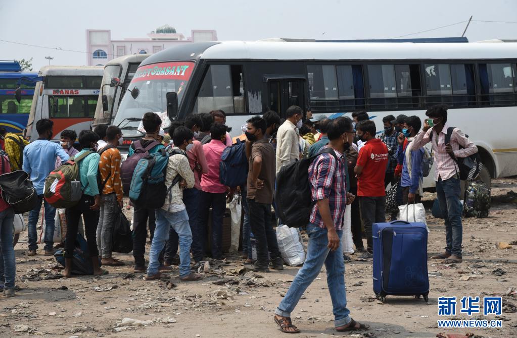 5月5日,印度比哈爾邦宣布實施封鎖措施后,人們在印度巴特那汽車站準(zhǔn)備乘坐巴士返回家鄉(xiāng)。