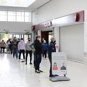 5月10日,人們在愛爾蘭首都都柏林一家重新恢復營業的理發館外排隊。