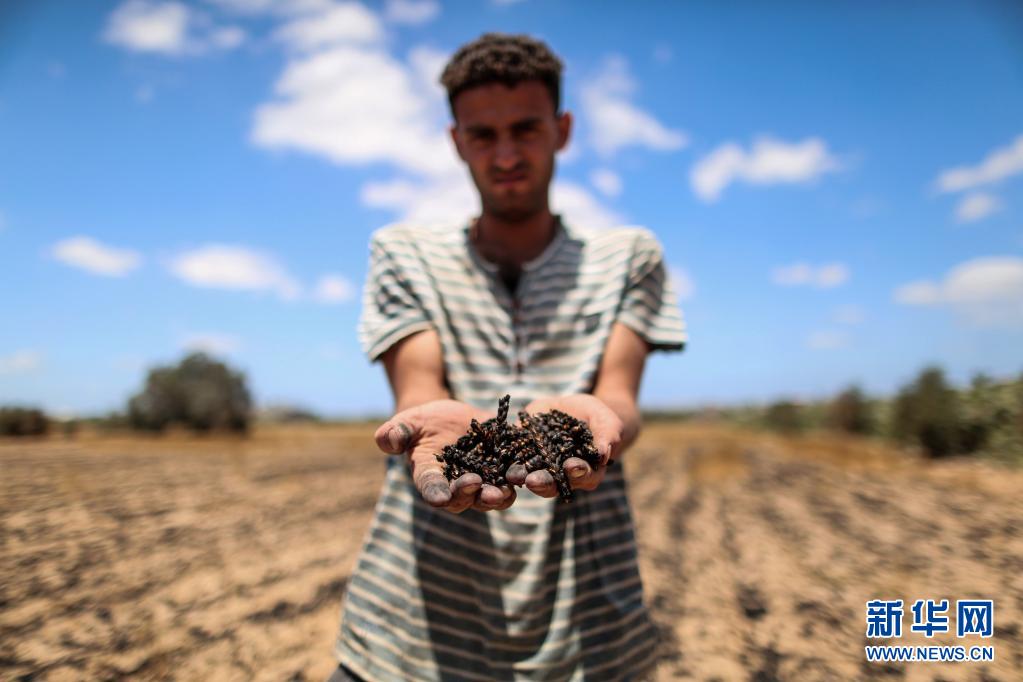 5月22日,在加沙地帶汗尤尼斯,巴勒斯坦農民手捧被以色列炮擊燒焦的麥子。新華社發(亞西爾攝)