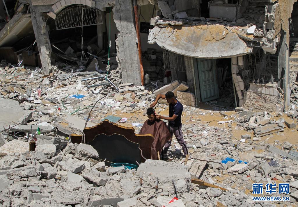 5月26日,在加沙地帶北部的城鎮貝特拉希亞,23歲的巴勒斯坦理發師阿卜杜拉·扎瓦拉在他被以色列炸毀的房屋前為顧客免費服務。 新華社發(里澤克·阿卜杜勒·賈瓦德攝)