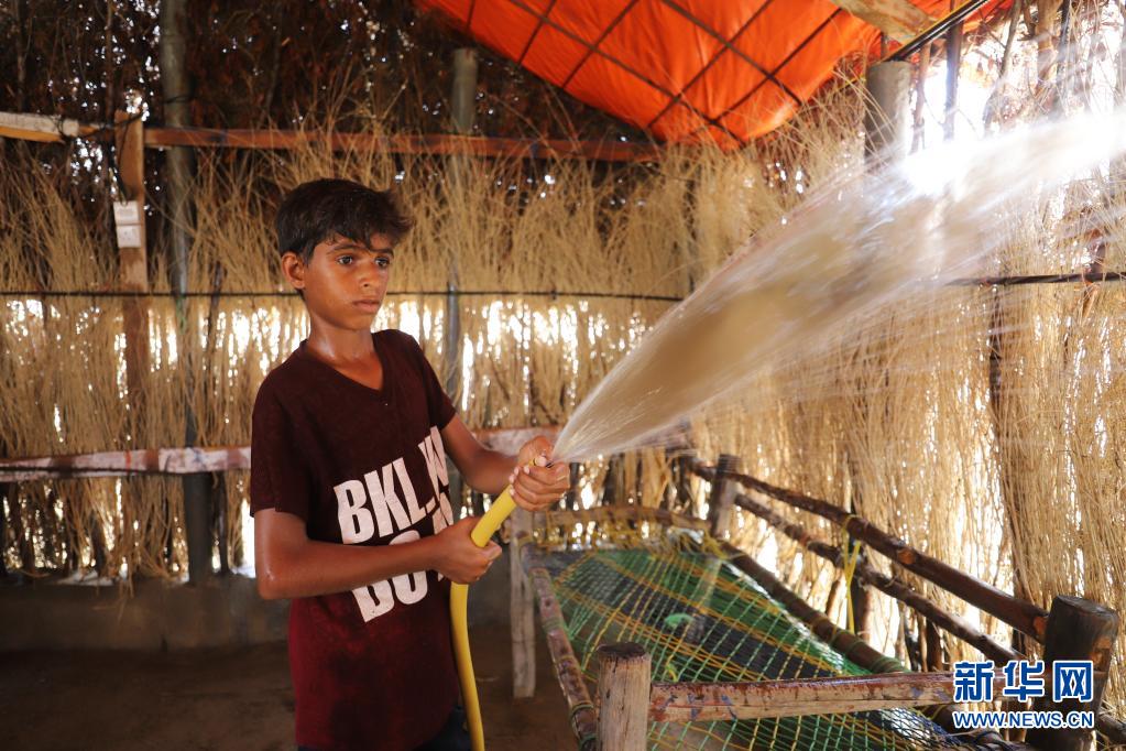6月17日,一名男孩在也門北部哈杰省的一座難民營內給自家的茅草屋澆水降溫。