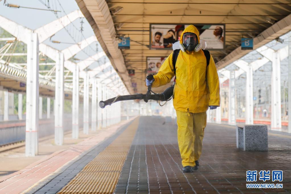 6月24日,工作人員身著防護(hù)服在俄羅斯莫斯科一個(gè)火車(chē)站進(jìn)行消毒作業(yè)。