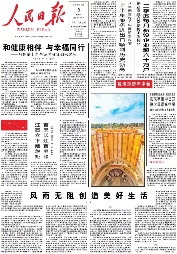 8月8日《人民日報》頭版截圖